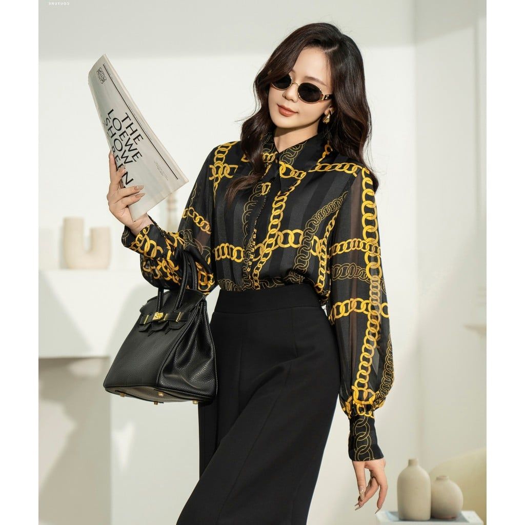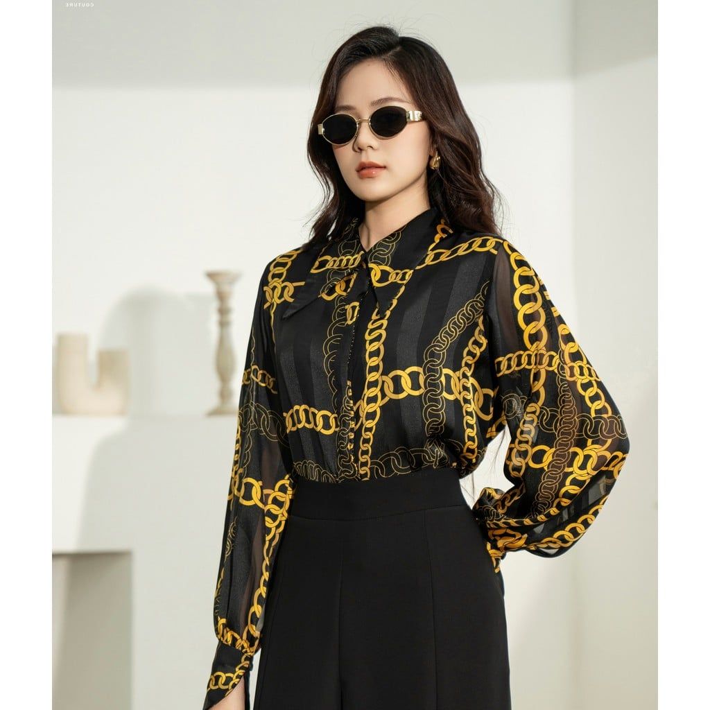 - Sản phẩm sơ mi cổ đức dài tay họa tiết xích vàng được làm từ chất liệu voan tơ lạnh Jacquard cao cấp, tinh tế và sang trọng.