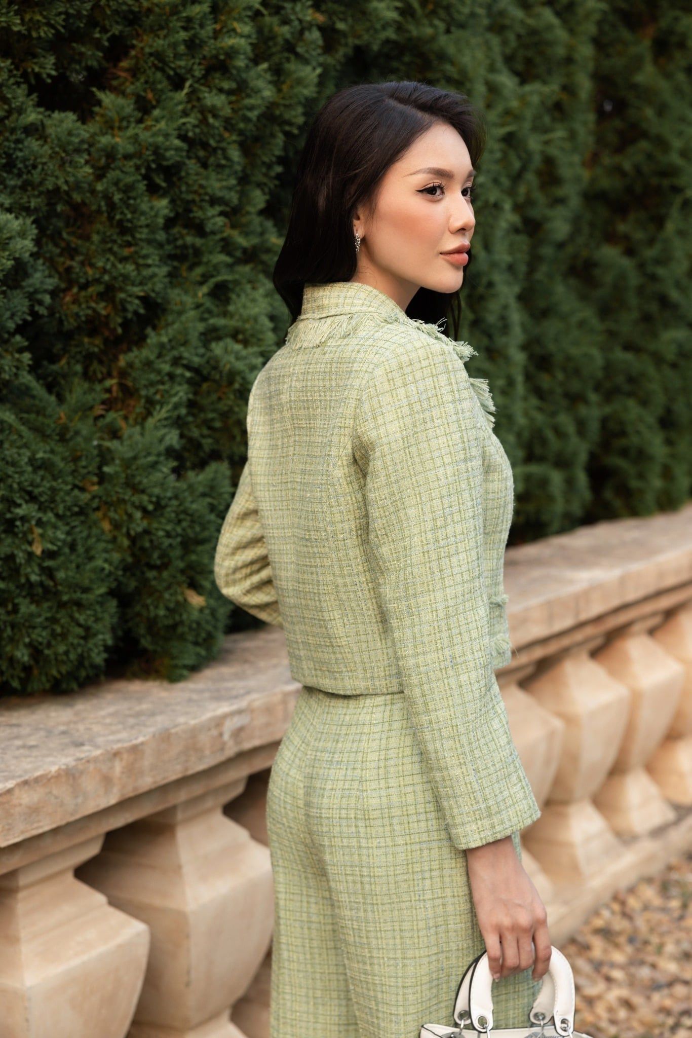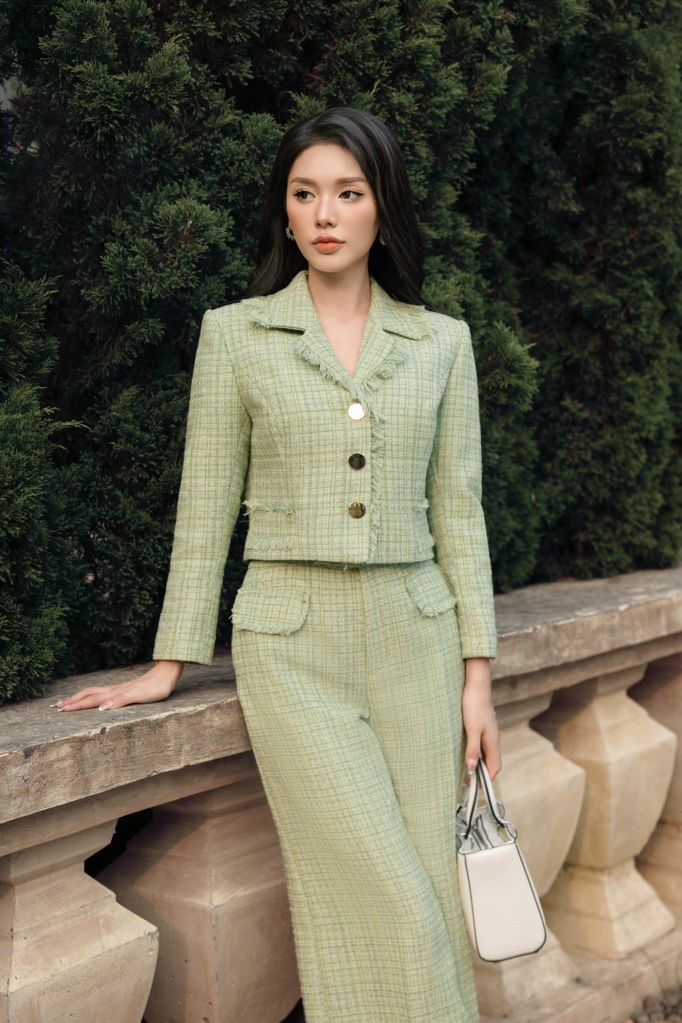 Bộ trang phục bao gồm áo khoác và quần âu với chất liệu vải tweed, một loại vải cao cấp thường được sử dụng trong các thiết kế thời trang thanh lịch và sang trọng. Vải tweed có đặc điểm bền, giữ ấm tốt và mang lại cảm giác thoải mái. Màu sắc xanh cốm nhạt của bộ đồ tạo cảm giác dịu mắt và thanh thoát.