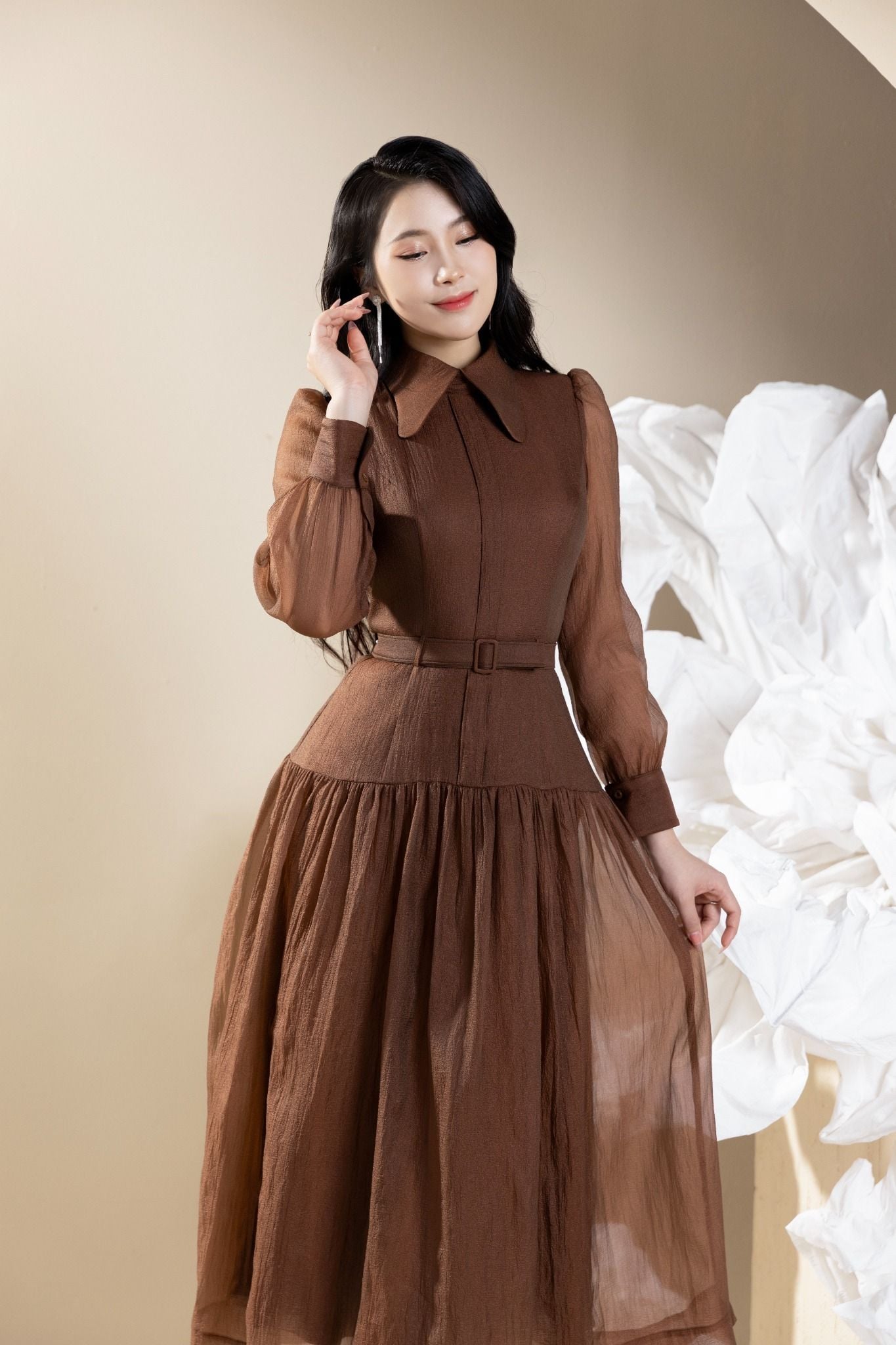• Dáng đầm liền, cổ đức, eo dài tôn lên vóc dáng thon gọn, cao ráo của người phụ nữ.