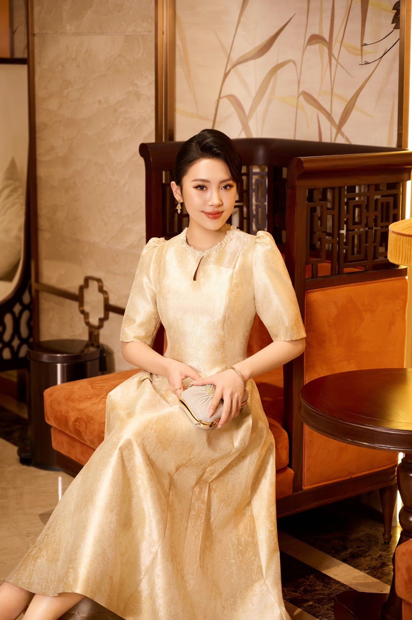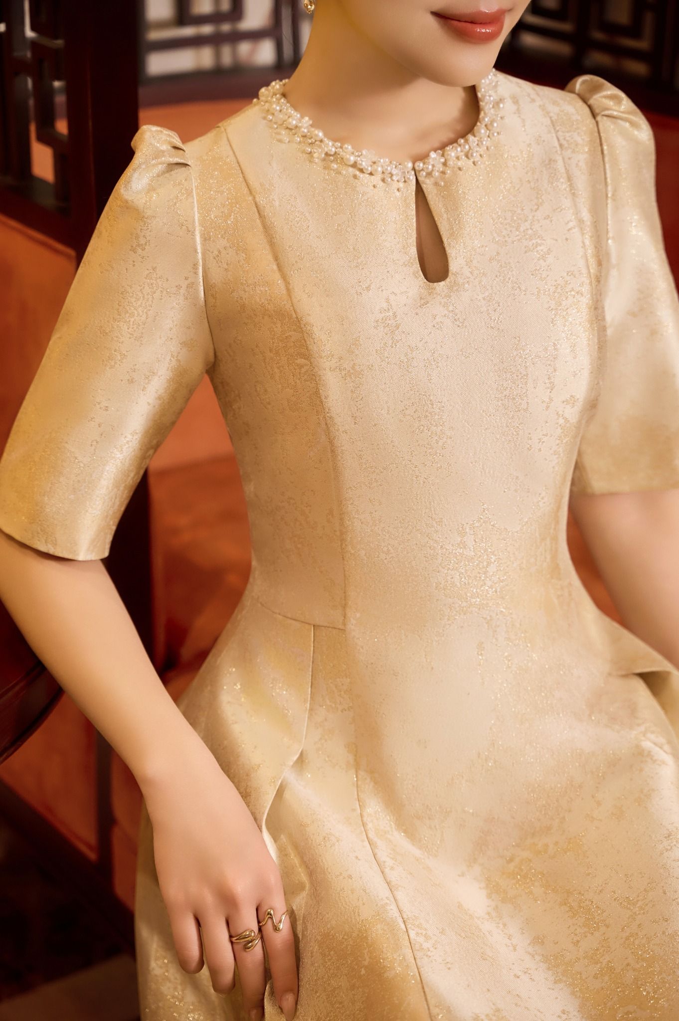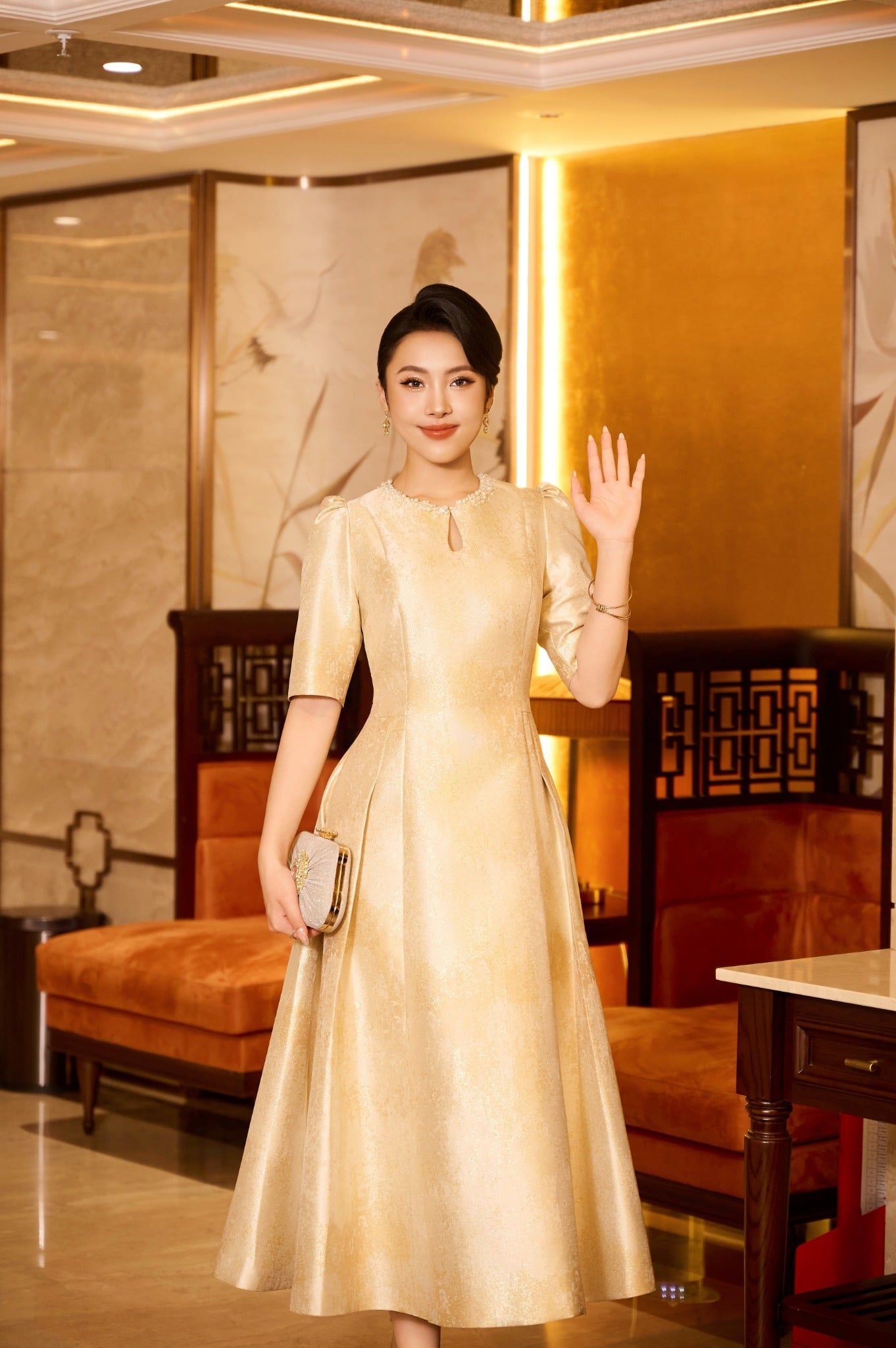 Chiếc đầm cổ tròn tay lỡ được may trên nền gấm jacquard Korean cao cấp với họa tiết vân be ánh kim sang trọng. Phần cổ áo được đính kết thủ công tinh xảo, tạo điểm nhấn lấp lánh đầy tinh tế. Thiết kế chân váy xòe nhẹ giúp tôn dáng mềm mại và thanh thoát. Sắc trắng kết hợp ánh be kim mang lại tổng thể thanh lịch, trang nhã và quý phái, phù hợp cho những dịp tiệc hoặc sự kiện trang trọng.