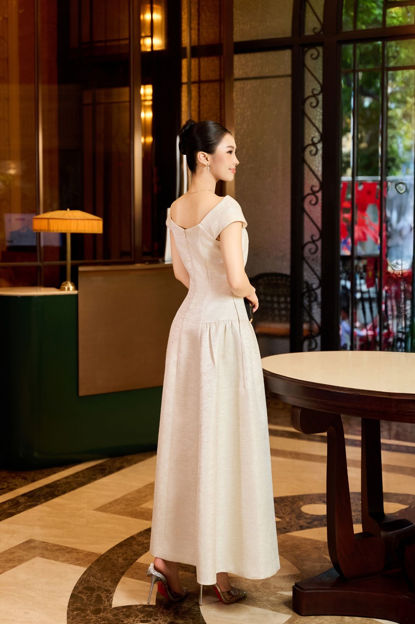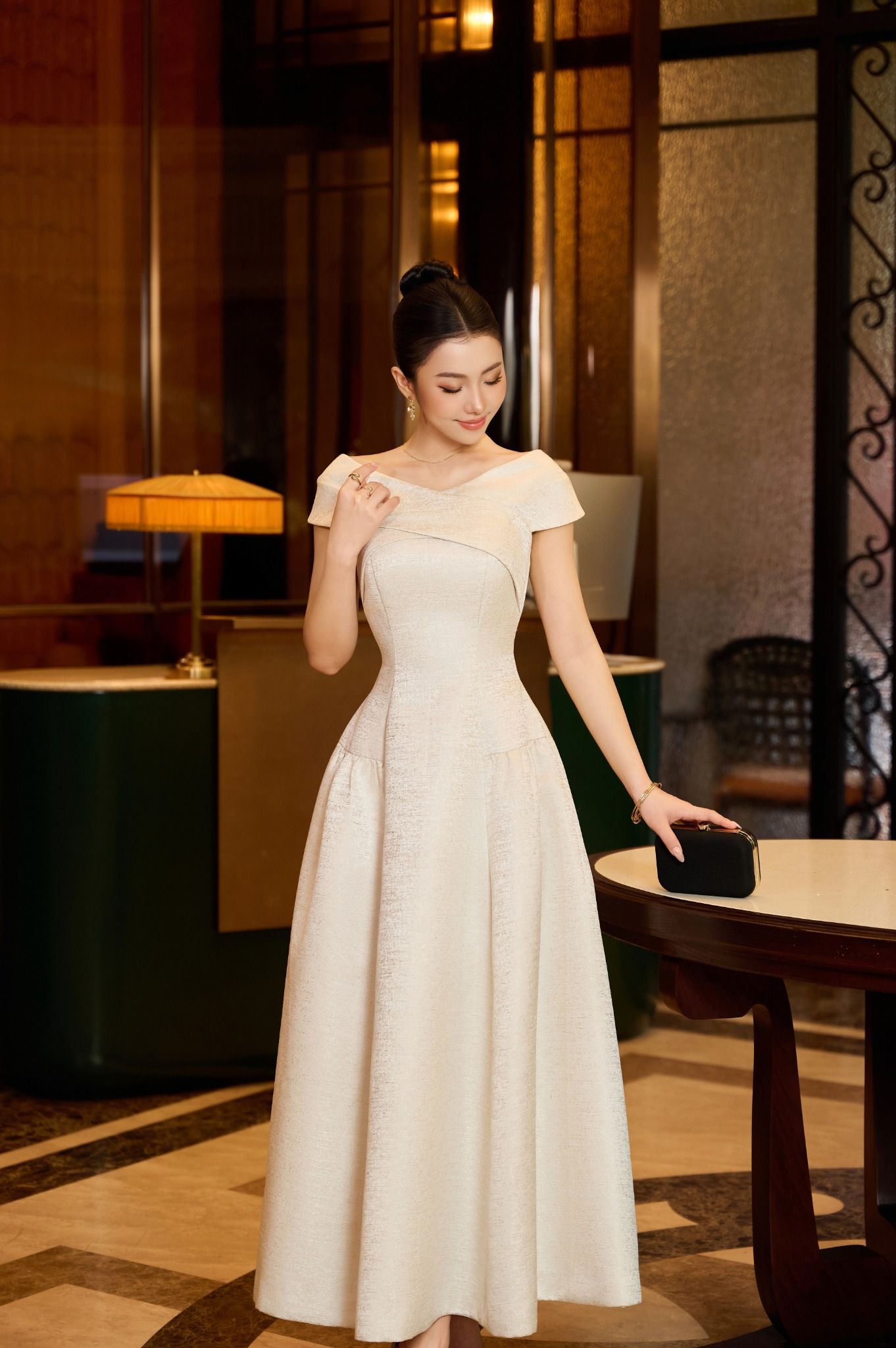 Thiết kế trễ vai tạo đường nét mềm mại cho phần cổ và vai, mang đến tổng thể thanh thoát và duyên dáng. Kết hợp gam trắng sang trọng, Quý cô sẽ nổi bật trong mọi không gian tiệc, từ trang trọng đến hiện đại. Chất liệu Taffeta Bamboo tạo độ đứng phom nhẹ nhưng vẫn mềm mại, giúp thiết kế luôn giữ được dáng đẹp mà không gây nặng nề. Phần chân váy xòe được xử lý tinh tế, mang đến chuyển động uyển chuyển khi bước đi. Điểm nhấn của thiết kế nằm ở các chi tiết đá đính thủ công tinh xảo giúp giữ trọn sự sang trọng mà không phô trương.