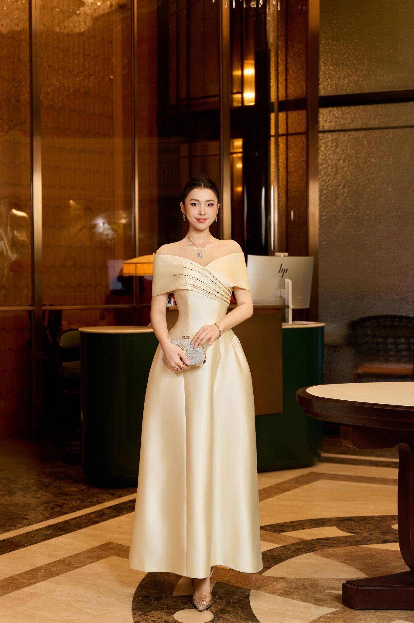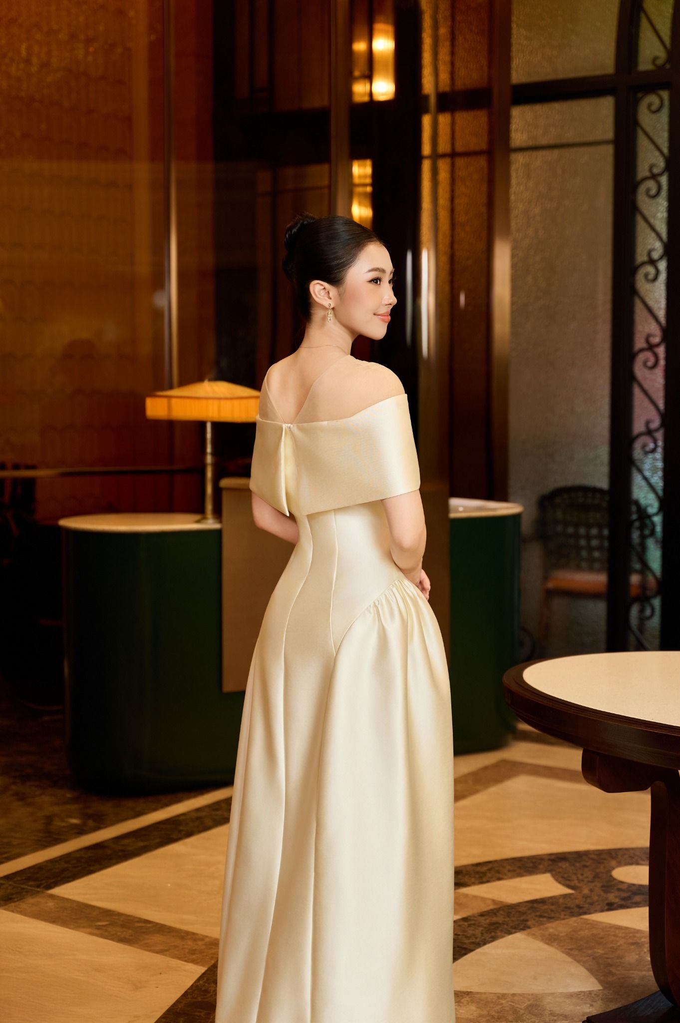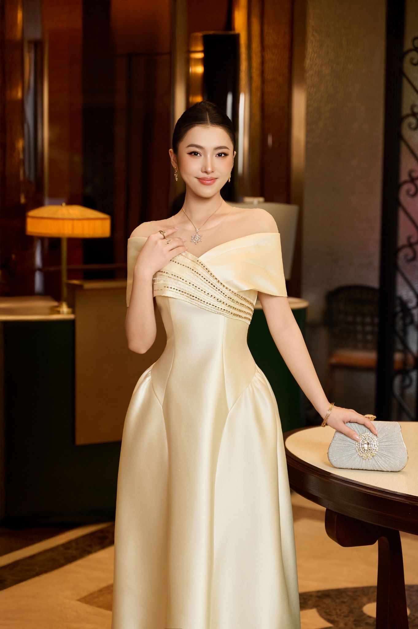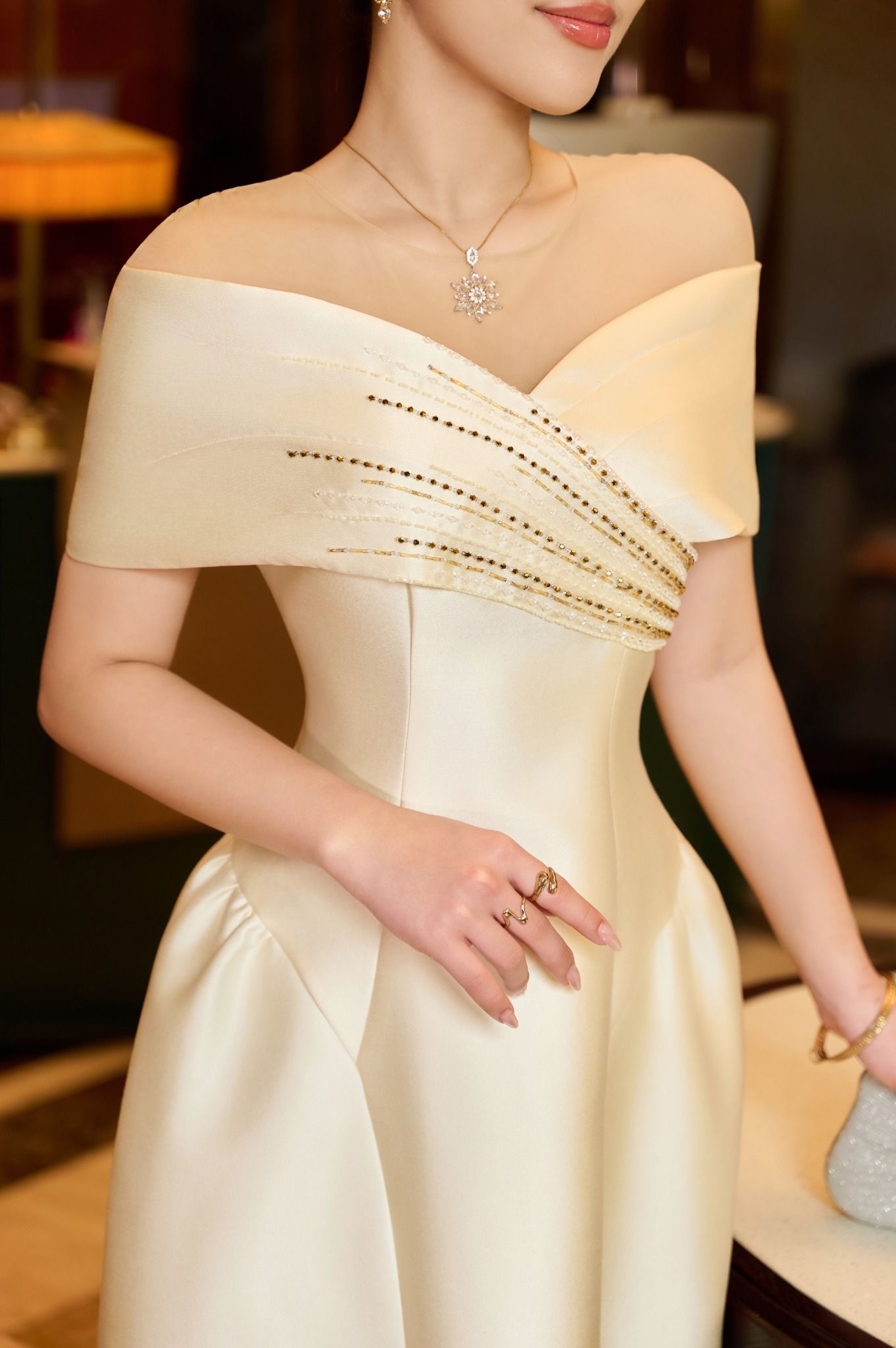 Thiết kế trễ vai kết hợp nhún eo mang đến cảm giác mềm mại và duyên dáng. Trong khi đó, sắc be nhẹ nhàng tạo nên vẻ thanh lịch phù hợp cho nhiều không gian tiệc khác nhau. Chất liệu Taffeta Bamboo đem lại độ đứng phom nhẹ và thoải mái. Các chi tiết đính đá tạo điểm nhấn tinh tế. Toàn bộ thiết kế hướng đến Quý cô trang nhã, nhẹ nhàng nhưng vẫn muốn giữ nét sang trọng trong mọi khoảnh khắc