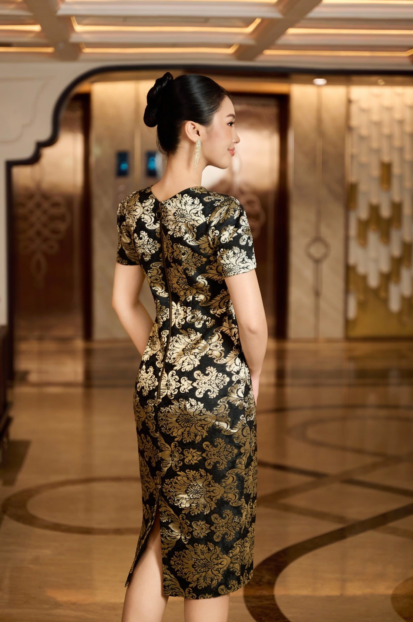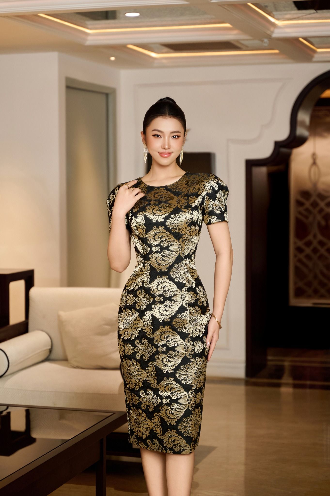 Thiết kế không đính kết cầu kỳ, thay vào đó là sức hút đến từ chất liệu và phom dáng. Phom bút chì ôm nhẹ, vừa vặn cơ thể, giúp đường nét được tôn lên khéo léo mà không quá gò bó. Họa tiết vàng ánh kim trên nền Gấm đen tạo chiều sâu thị giác, giúp Quý cô nổi bật nhưng vẫn giữ được sự tinh tế và đẳng cấp.