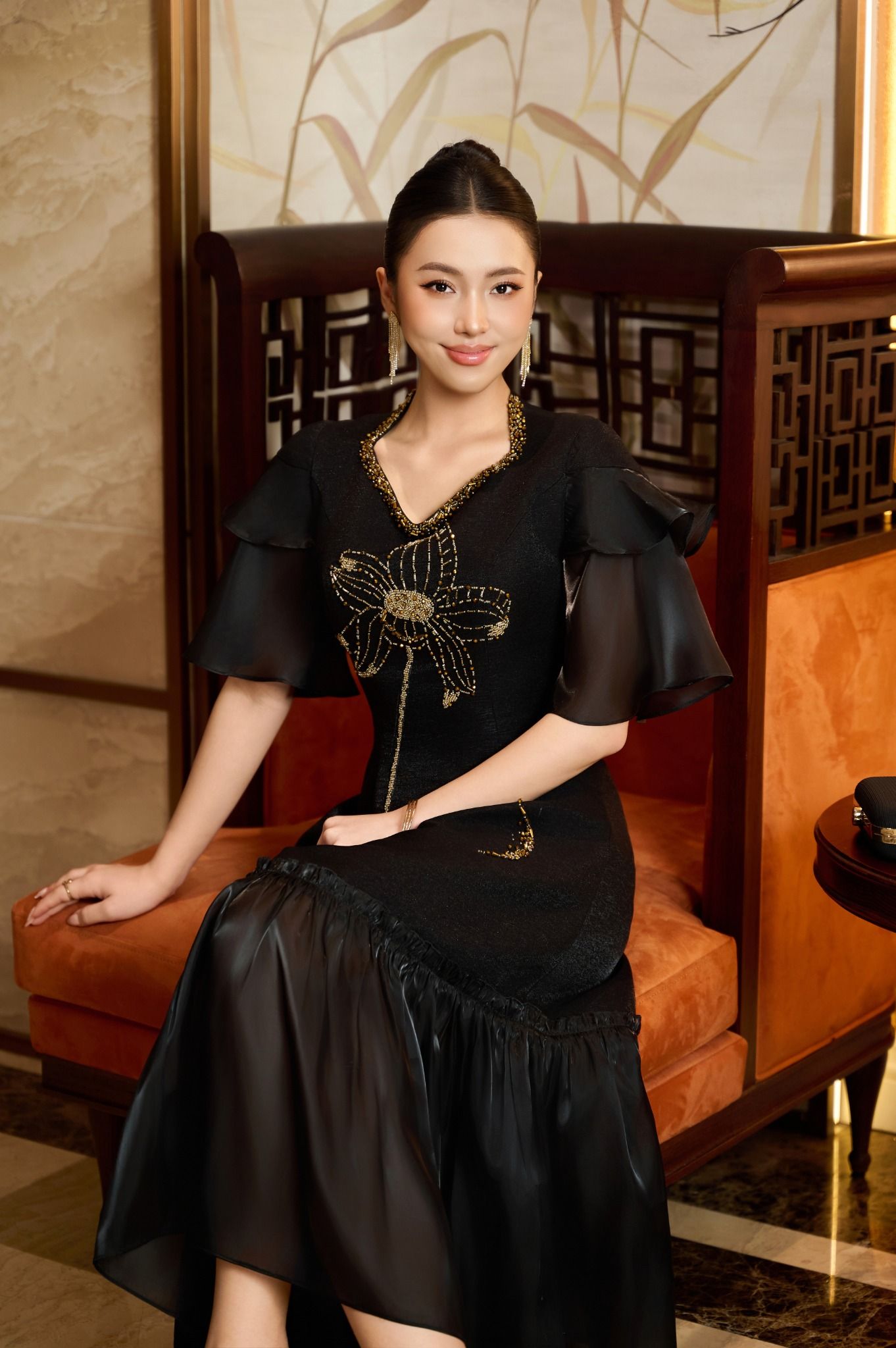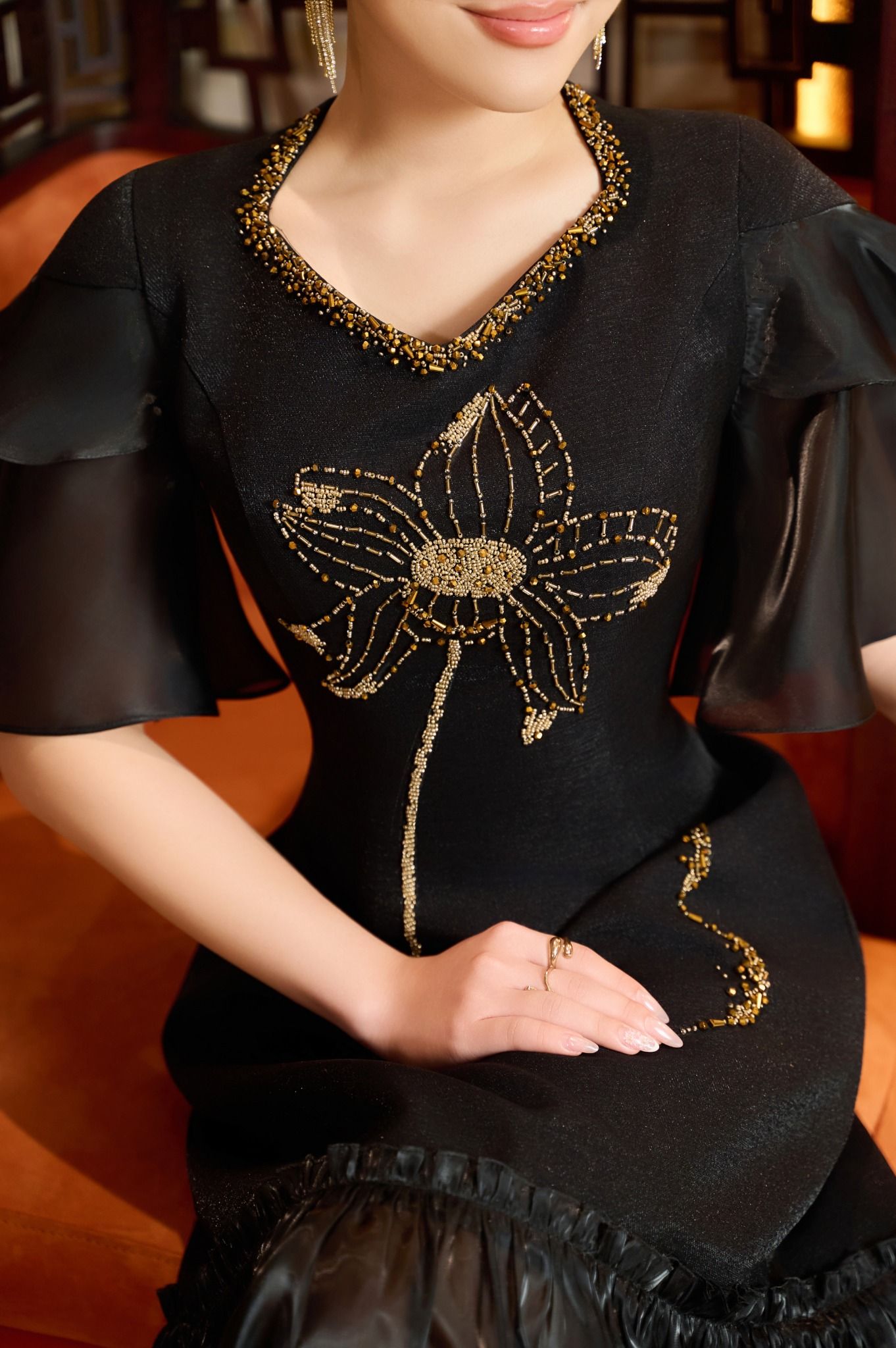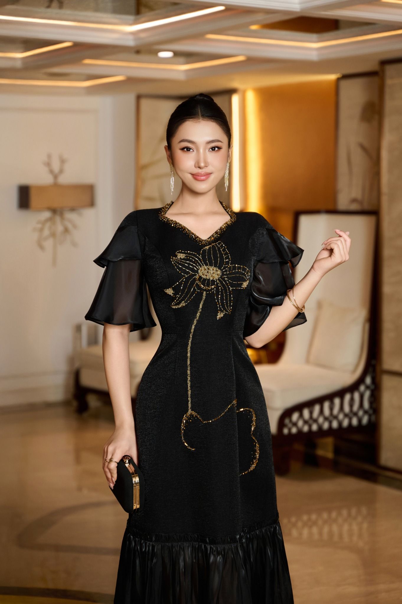 Sắc đen cổ điển kết hợp thiết kế hai dây trễ vai giúp người mặc dễ dàng nổi bật bằng thần thái và phong thái của riêng mình. Chất liệu Taffeta Bamboo mang lại độ đứng phom tinh tế và sự thoải mái khi mặc. Chi tiết đính đá ánh vàng được xử lý tỉ mỉ, mang lại vẻ sang quý mà vẫn thanh nhã.