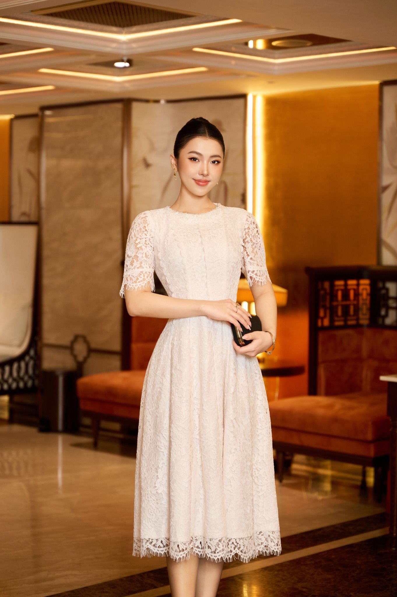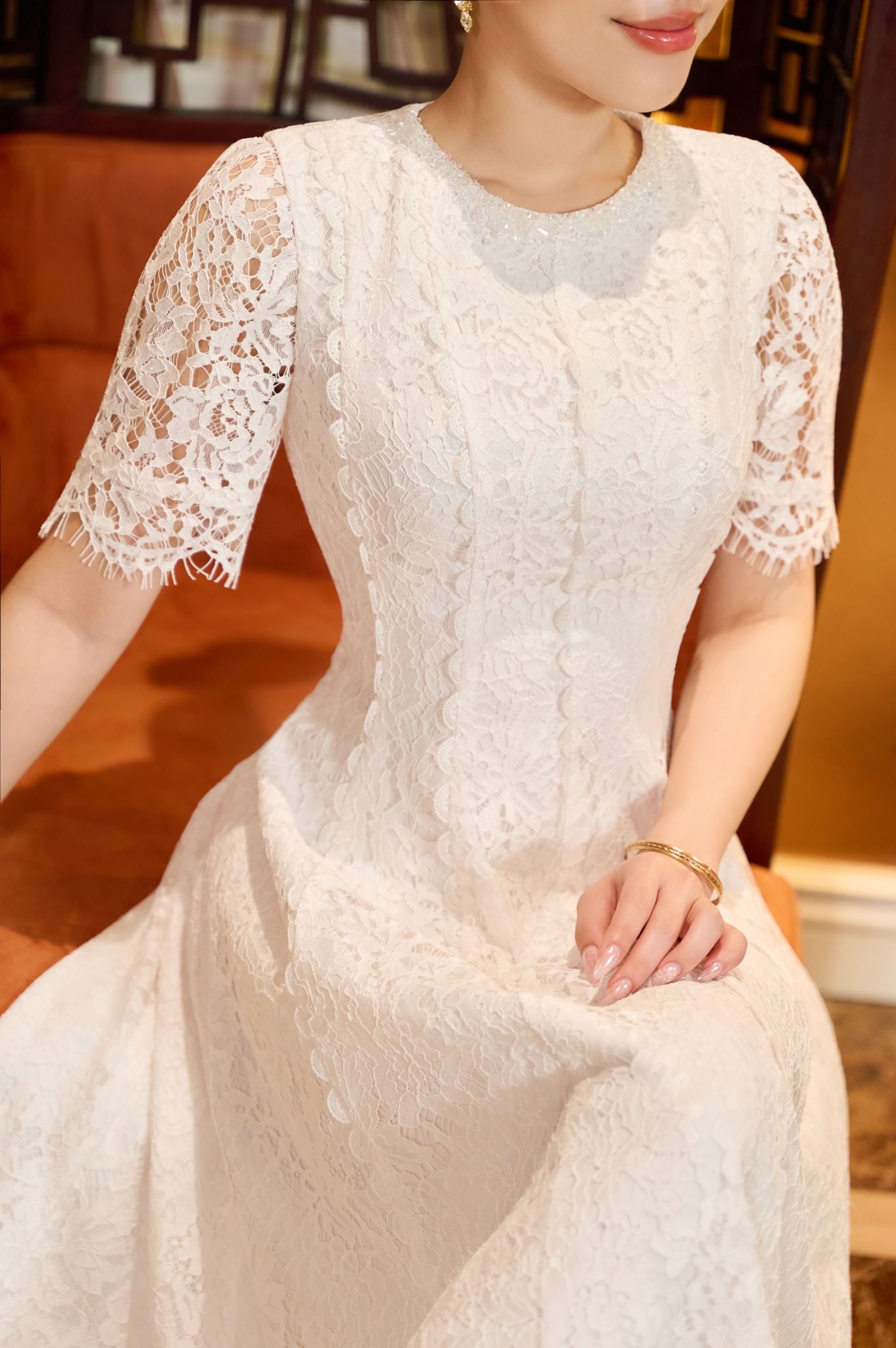 Sử dụng ren Raschel trắng làm chất liệu chủ đạo, thiết kế vừa có độ ôm và rũ vừa phải, vừa tạo phom dáng mềm mại, tôn đường nét mà không gò bó. Những hạt pha lê trắng được đính thủ công trên thân váy, tạo hiệu ứng bắt sáng tinh tế, giúp tổng thể vừa sang vừa cuốn hút mà không quá phô trương.