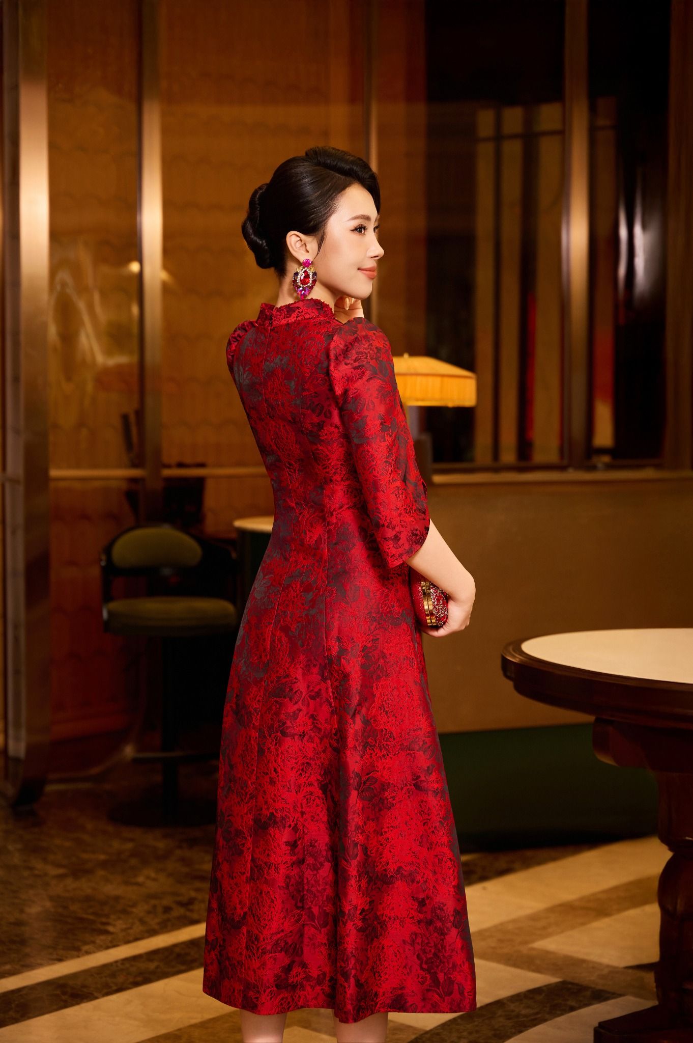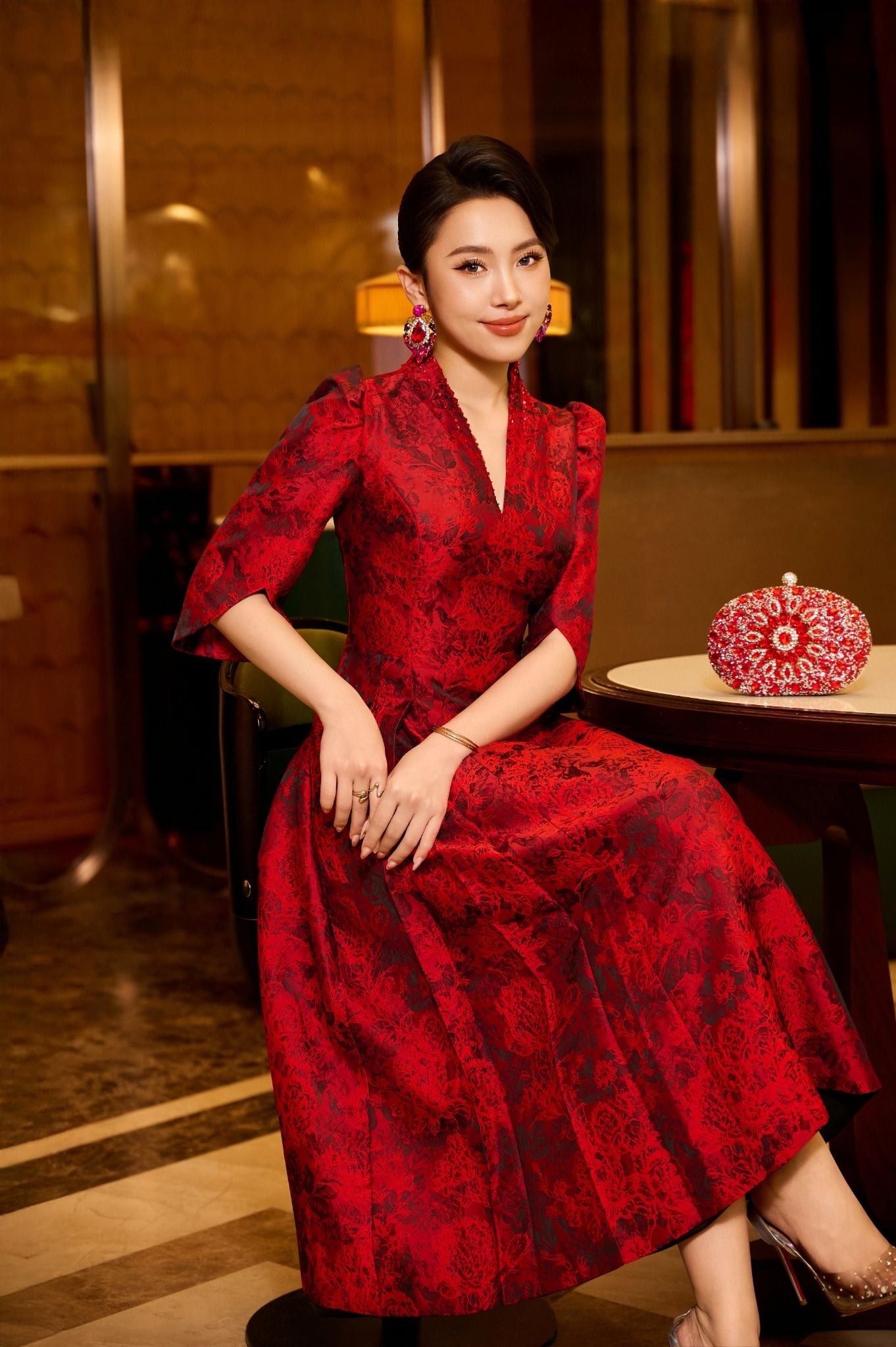 Thiết kế cổ V tay lỡ cùng chất liệu Gấm Jacquard cao cấp tạo cảm giác thanh thoát, trong khi chi tiết đính đá lấp lánh ở cổ là điểm nhấn tinh xảo tôn thêm nét quý phái. Trong khi đó, phần váy xòe nhẹ giúp tôn dáng và tạo chuyển động mềm mại, khiến tổng thể vừa sang trọng, vừa đậm tinh thần couture.