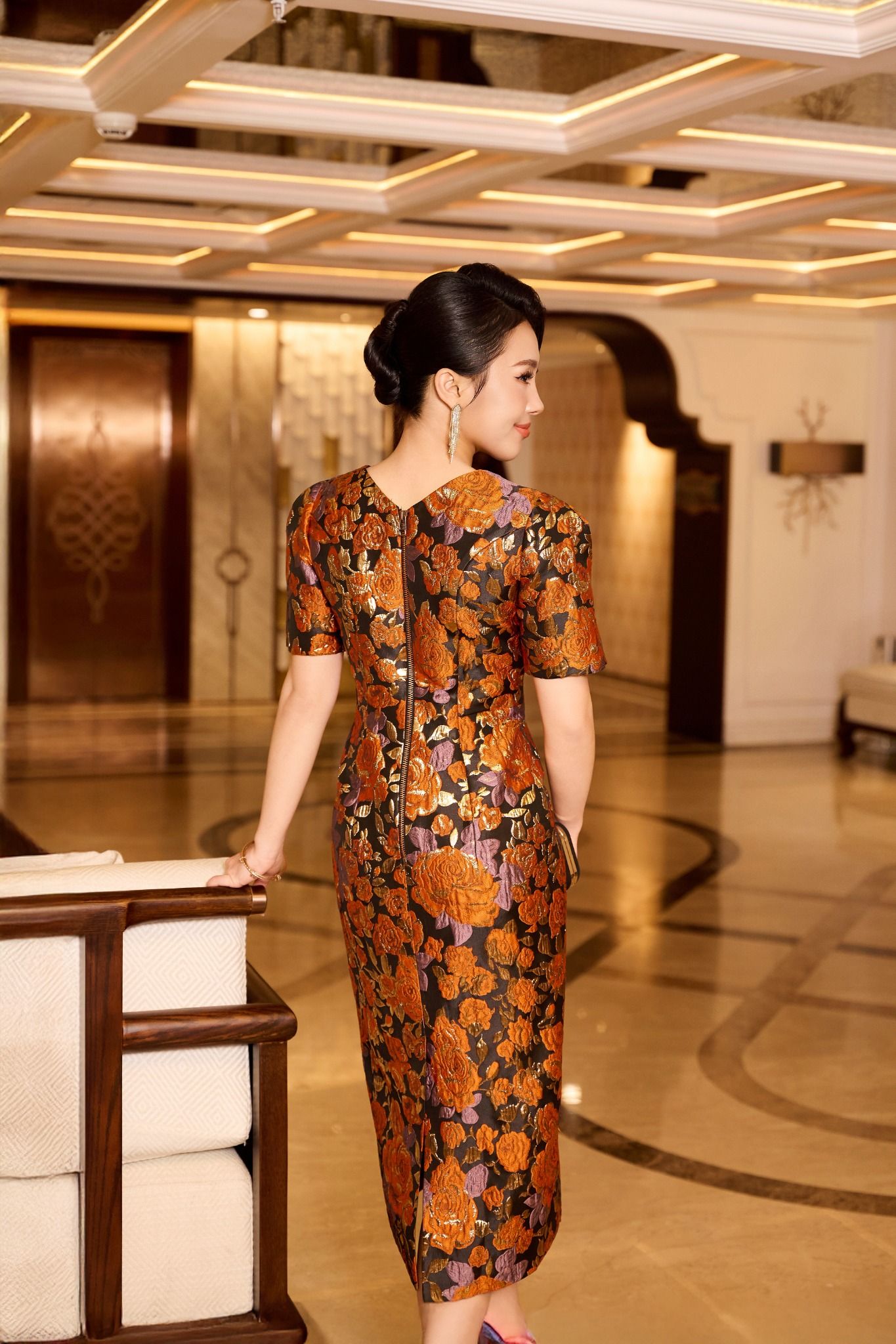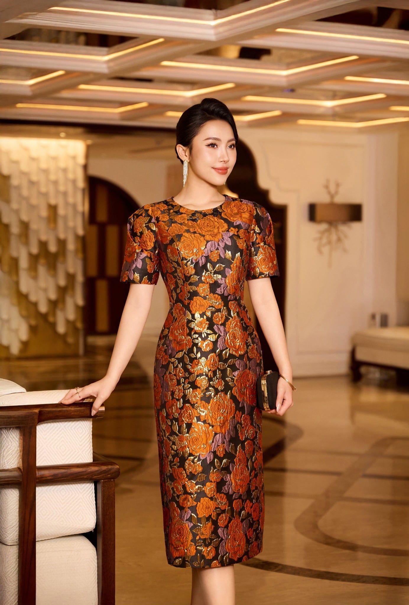 Họa tiết hoa cam ánh vàng được dệt tinh xảo tạo hiệu ứng rực rỡ mà không chói mắt, tôn lên sự ấm áp và rạng rỡ tự nhiên. Thiết kế ôm nhẹ theo đường cong cơ thể, giúp người mặc toát lên vẻ thanh mảnh, hiện đại và đầy cuốn hút.