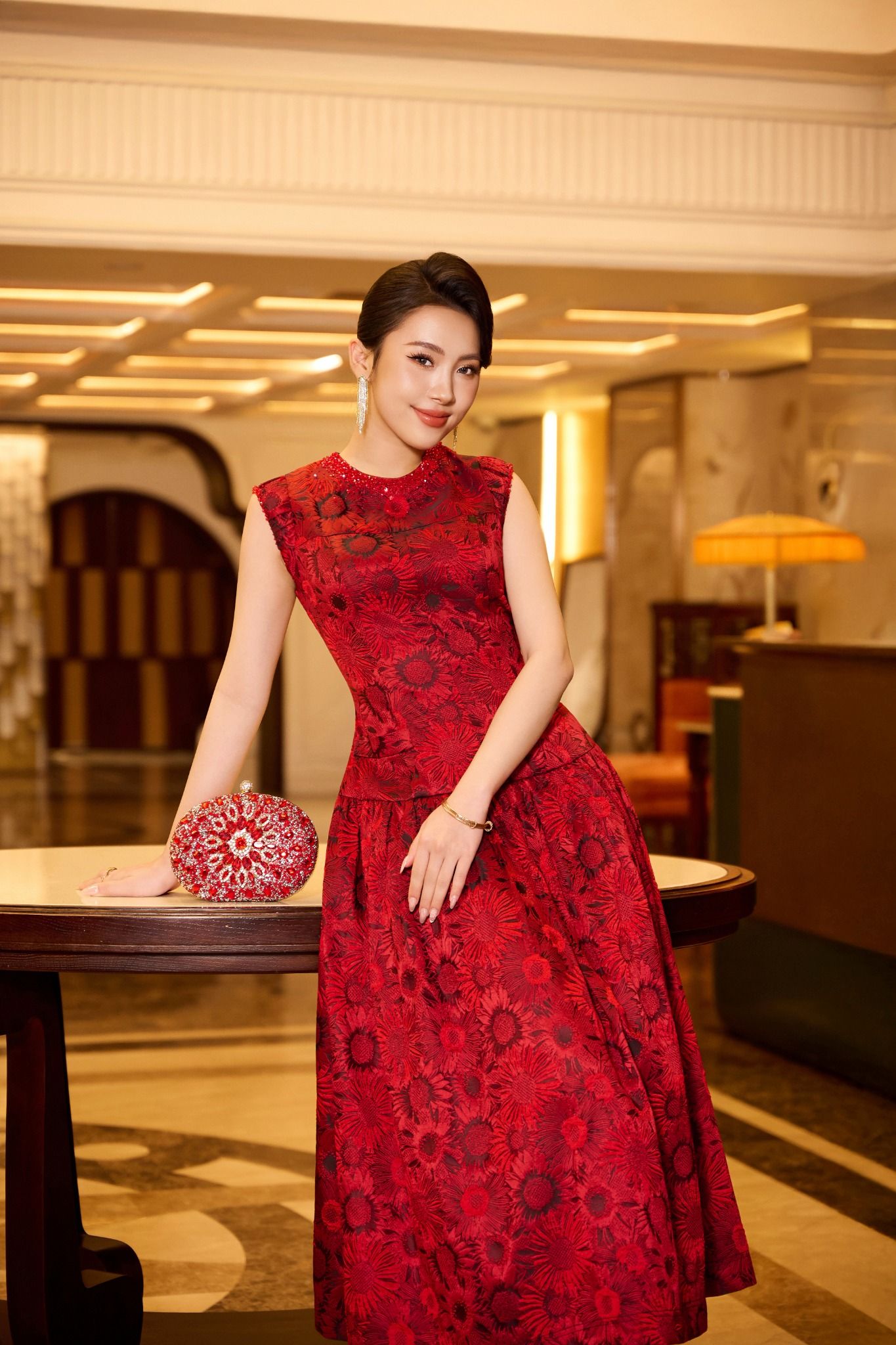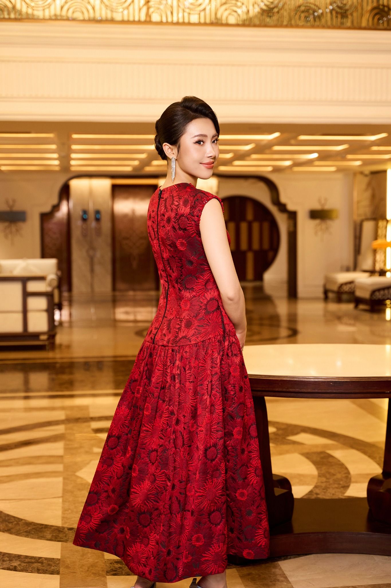 Phom váy xòe nhẹ, cổ tròn sát nách cùng chi tiết vai chờm giúp tôn dáng, tạo đường nét thanh thoát mà vẫn mạnh mẽ. Chất liệu Gấm Jacquard được xử lý khéo léo để phản chiếu ánh sáng nhẹ, mang đến hiệu ứng thị giác cuốn hút ở mọi góc nhìn.