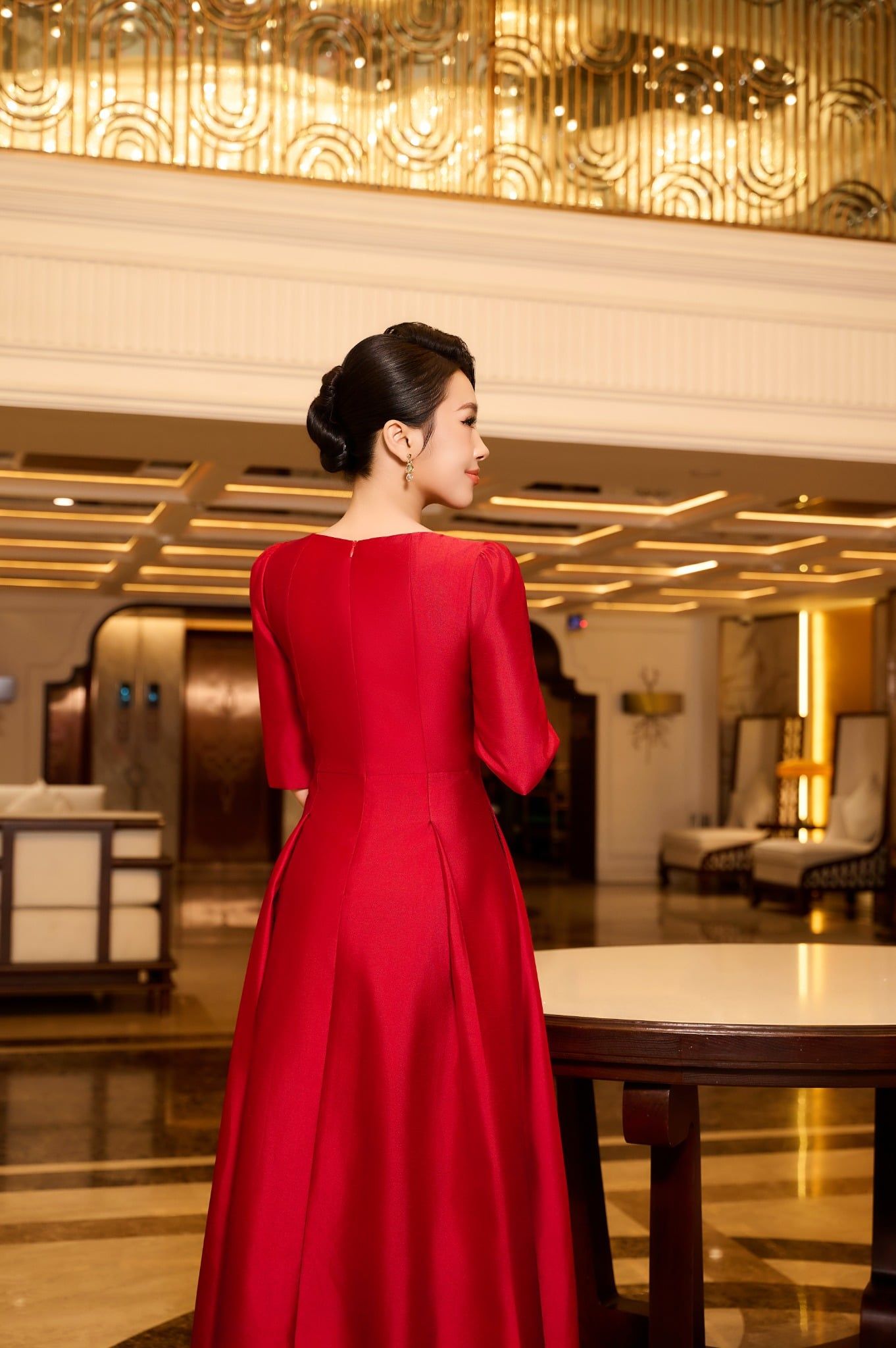 Chiếc đầm tay lỡ cổ tròn được thiết kế trên nền chất liệu tafta tre cao cấp, mang phom váy xòe nhẹ tôn dáng thanh lịch. Điểm nhấn nổi bật là chi tiết hoa đá đính kết thủ công tinh xảo, tạo hiệu ứng lấp lánh sang trọng. Sắc đỏ quyến rũ kết hợp cùng chất liệu ánh nhẹ giúp người mặc toát lên vẻ quý phái, tự tin và duyên dáng trong mọi dịp đặc biệt.