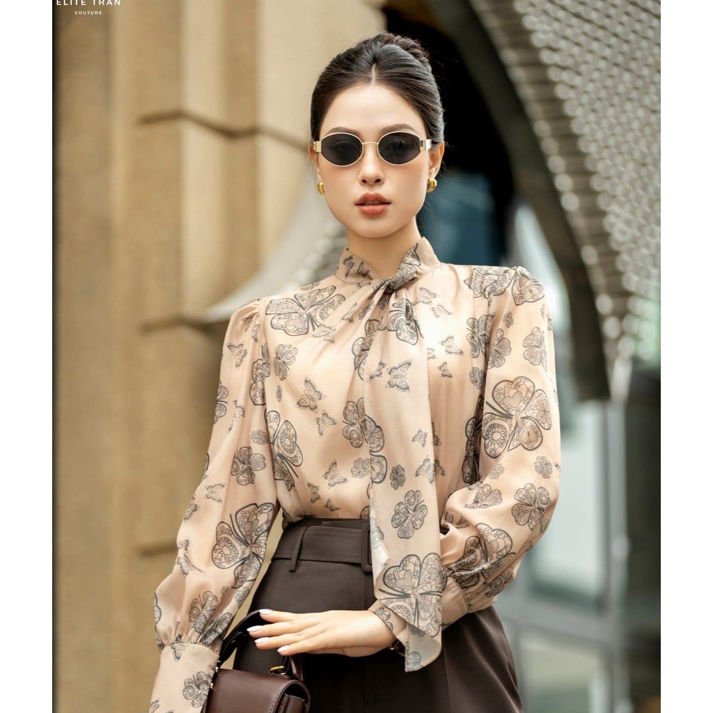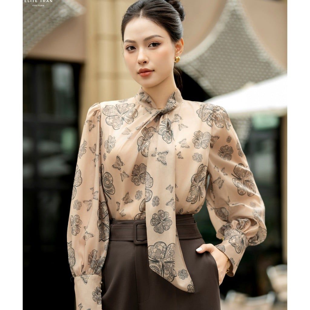 Cổ thắt nơ mềm mại – Phần cổ áo được thiết kế với một dải vải dài có thể buộc nơ hoặc thả lỏng, tạo điểm nhấn tinh tế và duyên dáng. Kiểu cổ này rất phù hợp với môi trường công sở hoặc những dịp cần sự trang trọng.