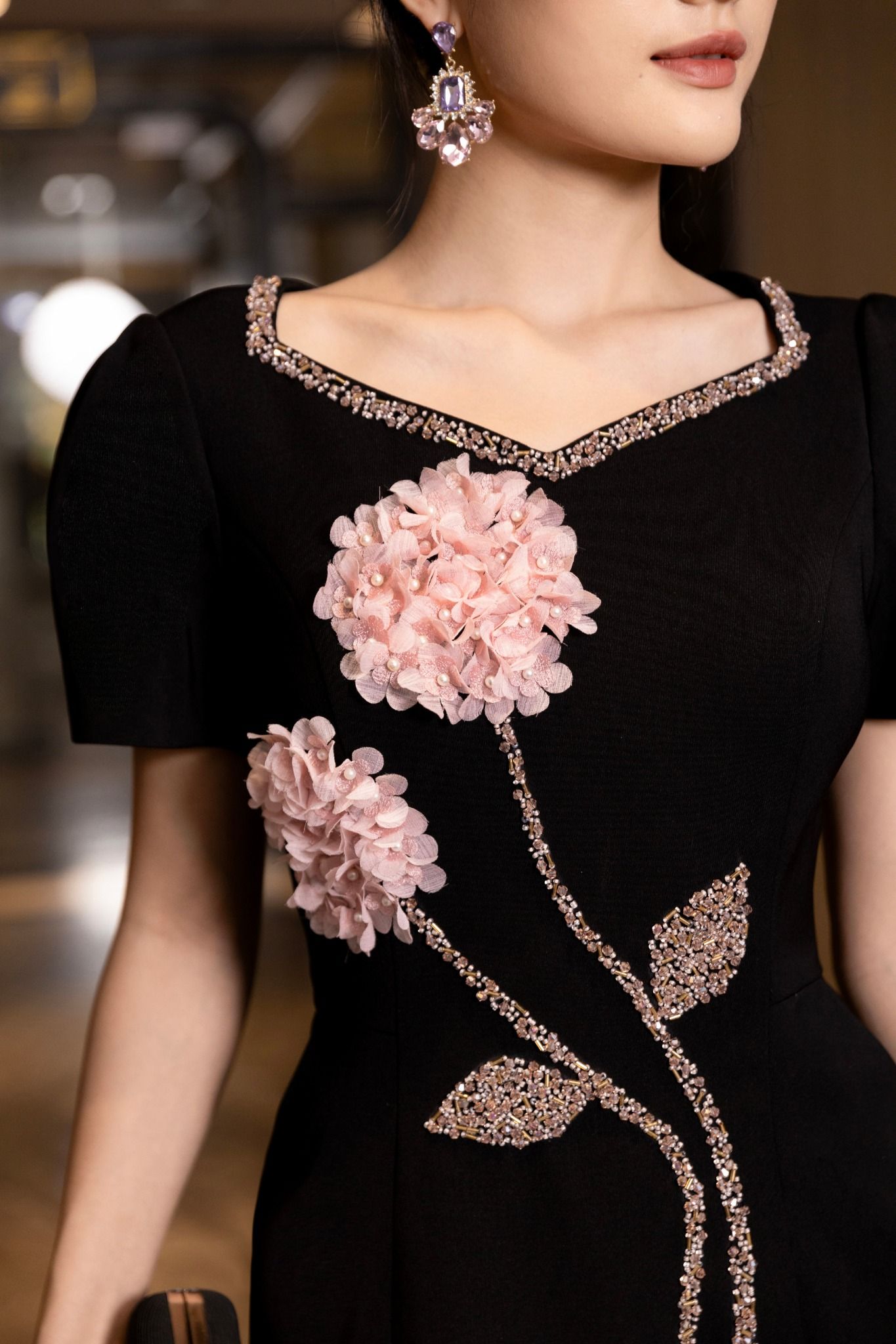 Kiểu dáng ôm vừa vặn, tôn lên đường cong cơ thể mà vẫn tạo cảm giác thoải mái khi mặc. Phần eo được nhấn nhẹ, giúp tạo dáng thon gọn và thanh mảnh. Chất liệu cao cấp: Chất liệu vải đen mềm mại, sang trọng với độ co giãn nhẹ, giúp người mặc thoải mái và dễ dàng di chuyển. Phần viền cổ và các chi tiết hoa đính kết tinh xảo, mang lại sự lộng lẫy nhưng không quá phô trương, phù hợp cho các sự kiện trang trọng.