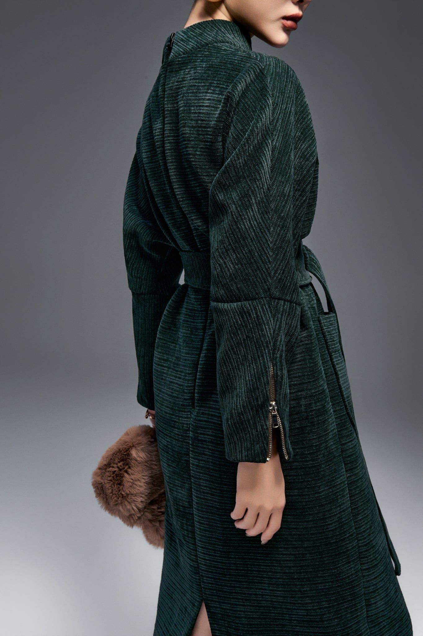 Đầm liền nhung tuyết vân ngang màu racing green là sự hòa quyện giữa vẻ đẹp sang trọng và thiết kế hiện đại. Chất liệu nhung tuyết mềm mịn với hiệu ứng vân ngang độc đáo tạo chiều sâu và sự khác biệt. Cổ cao 5 phân giúp tôn lên vẻ thanh thoát, trong khi tay cánh dơi phóng khoáng mang lại cảm giác thoải mái nhưng không kém phần quyền lực. Điểm nhấn cổ tay phối khóa và đai cùng chất liệu giúp chị định hình vóc dáng, tạo nên sự tự tin và đẳng cấp.