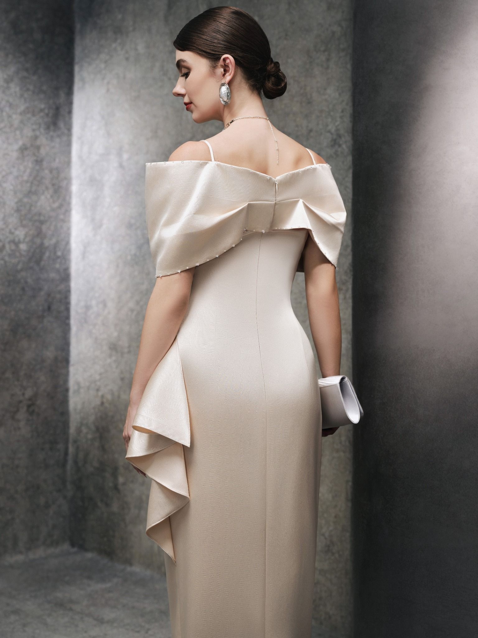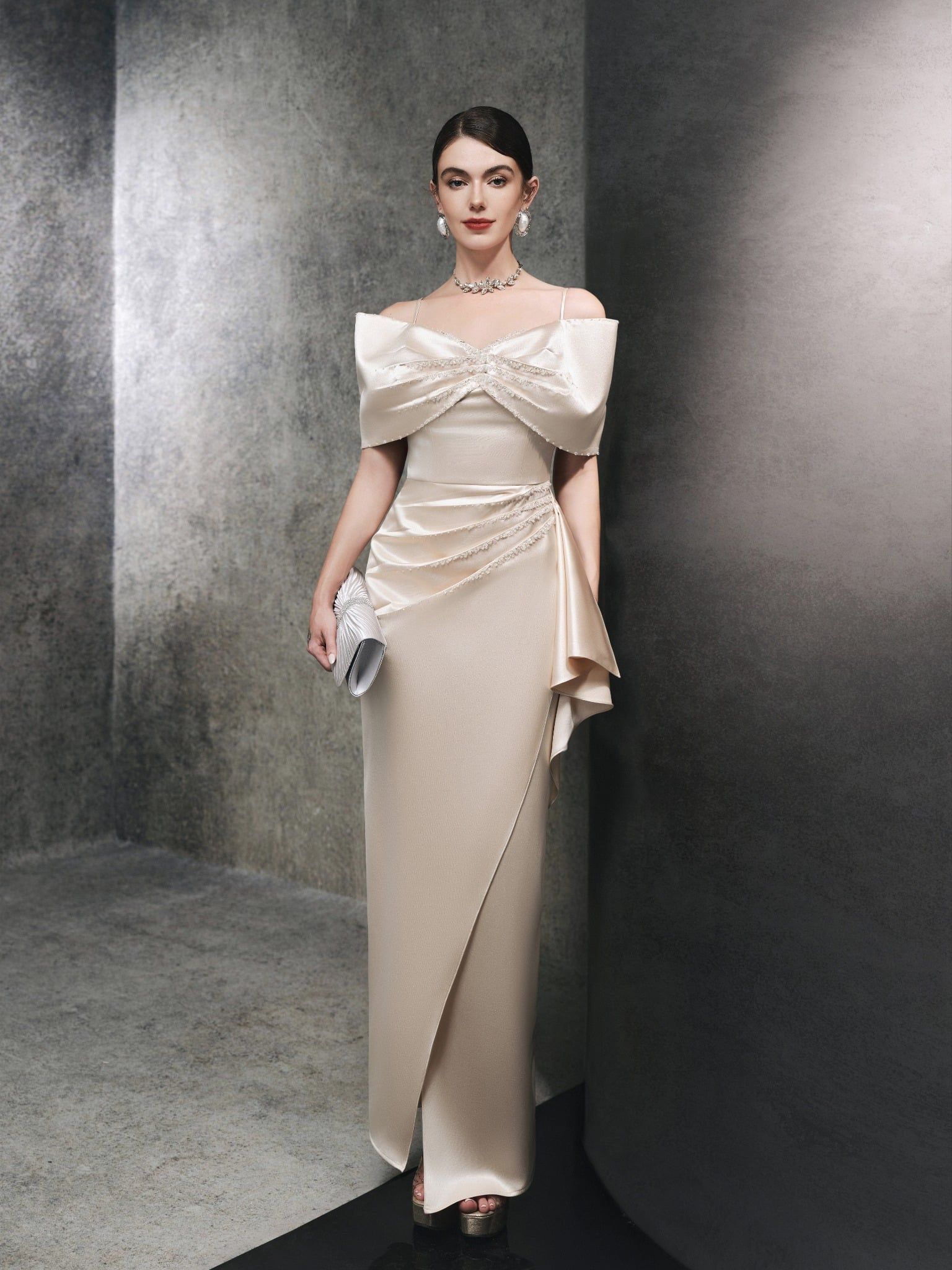 Thiết kế vai trễ tinh tế, chiếc váy khéo léo tôn lên phần xương quai xanh và cổ, mang lại vẻ đẹp thanh thoát và quý phái. Chất liệu satin cao cấp không chỉ tạo độ bóng mượt mà còn mang lại cảm giác mềm mại và ôm sát cơ thể, giúp tôn lên đường cong một cách nhẹ nhàng và quyến rũ. Các chi tiết đính kết tinh xảo ở phần ngực và eo làm tăng thêm độ lấp lánh, cuốn hút. Phần váy được dựng form cẩn thận, tạo nên dáng váy ôm sát nhưng không hề bó, giúp che đi khuyết điểm vòng hai, đồng thời tạo sự thoải mái khi di chuyển. Đây thực sự là một thiết kế hoàn mỹ cho những quý cô yêu thích sự sang trọng, tinh tế nhưng không kém phần quyến rũ.